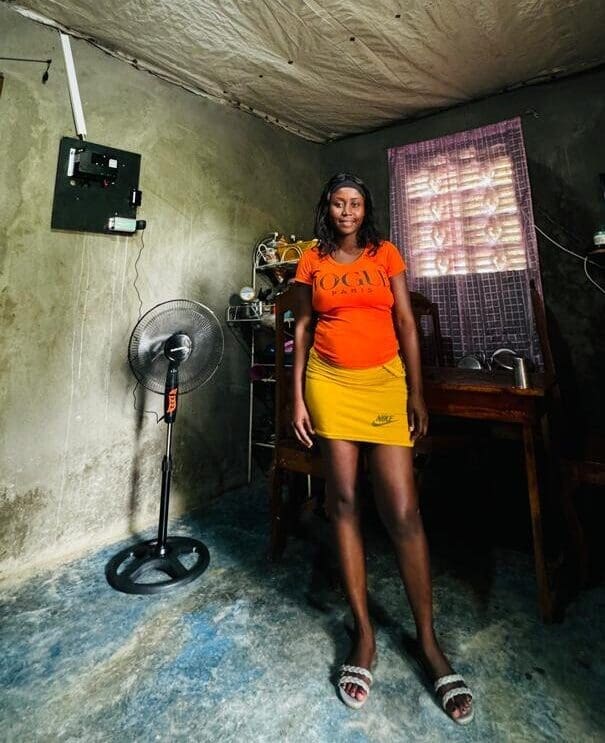A happy Alina customer after being connected to the grid. Alina supplies all connected households with fans and lighting. (Photo Courtesy of Alina Enèji)